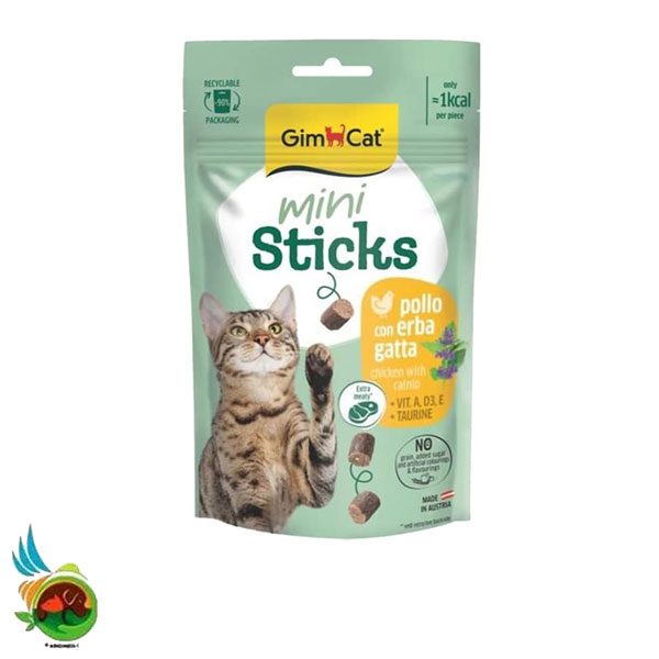 معرفی محصول تشویقی گربه مینی استیک طعم مرغ و کت نیپ Gimcat mini sticks with chicken & catnip وزن ۵۰ گرم