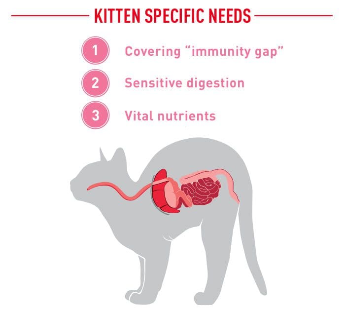 بچه گربه ها به وعده های غذایی کوچک به دفعات زیادی نیاز دارند. این وعده ها گاهی اوقات به ۱۰-۱۶ بار در روز می رسند.